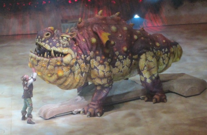Here is Hiccup when he first meets Toothless. The animatronic Dragons are unbelievable. The technology in this show is truly amazing and nothing I have ever seen before. I was very impressed with the production and technology in this show. The show is visually stunning. The whole floor and background is a canvas that is used throughout the show to portray different backdrops.